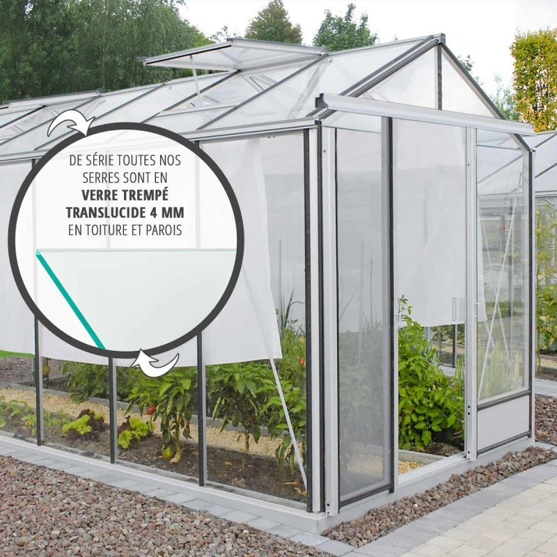 Le vitrage de la serre est du verre trempé de 4mm d’épaisseur, 7 fois plus résistant que le verre horticole et non tranchant en cas de bris. Grâce aux joints en néoprène qui se fixent en toute facilité sur les profilés, vous pouvez opter pour un vitrage en polycarbonate jusqu’à 8mm d’épaisseur, en option. Pour la toiture, nous vous proposons sans aucun surcoût l’option du verre martelé, qui apporte un léger ombrage.