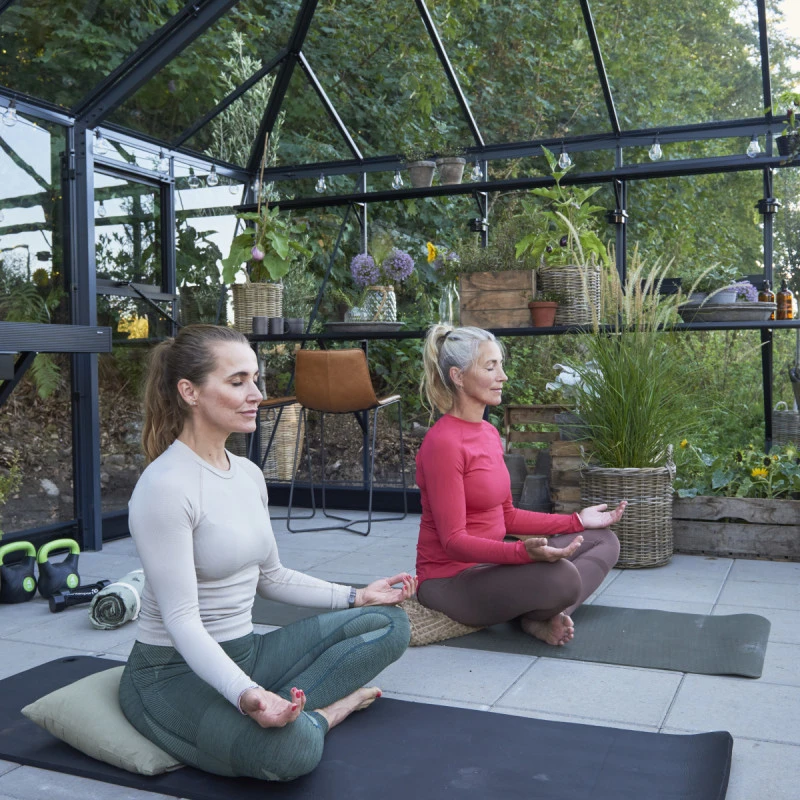 La grande hauteur de 195cm des parois et le faîtage culminant à 331cm libèrent un espace ample et agréable à vivre, tout comme la double porte qui fournit un accès confortable et pratique grâce à son seuil rabaissé. La serre Grand Oase pourra donc convenir comme jardin d’hiver, comme pièce supplémentaire pour la lecture ou la méditation, ou pour la culture de plantes hautes ou l’utilisation d’un système de palissage.