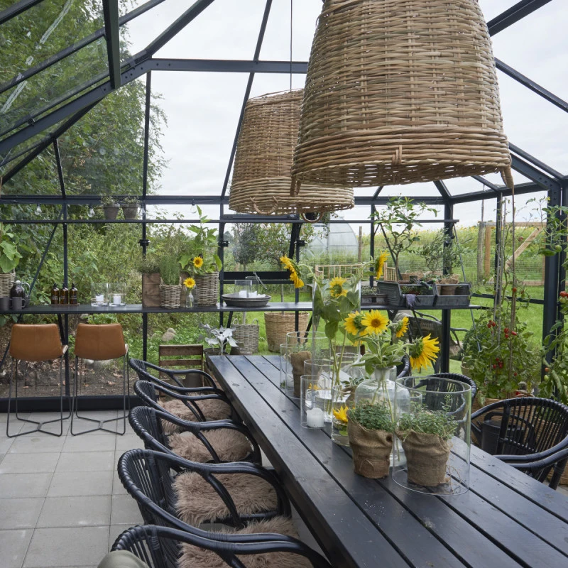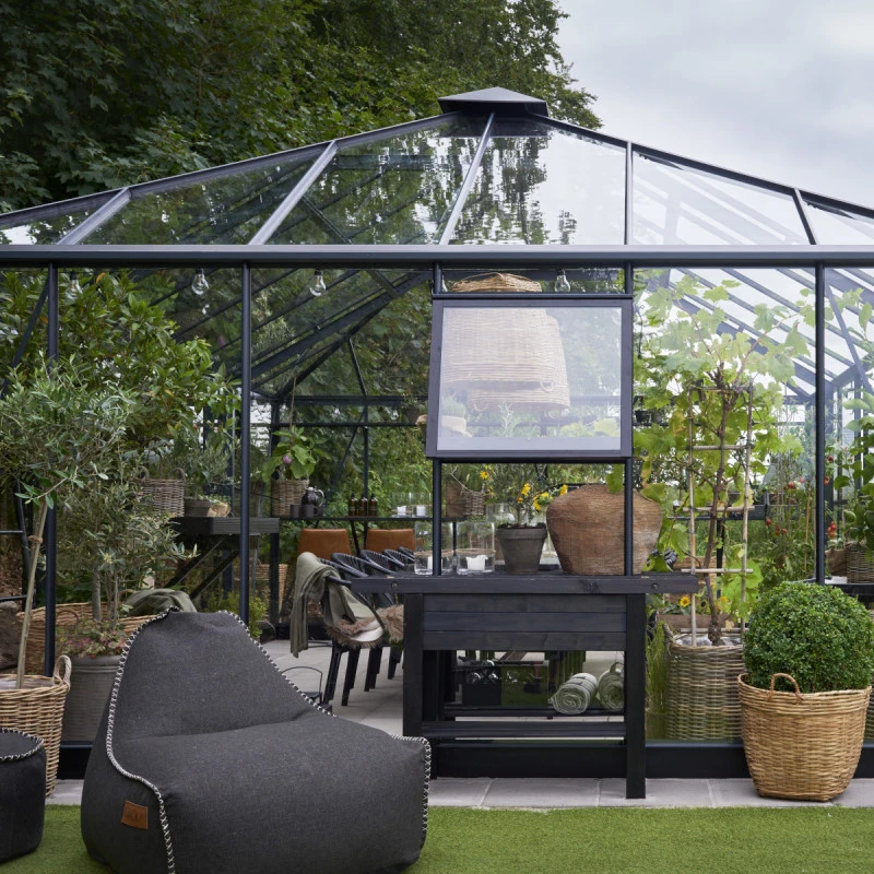Avec sa façade de 439cm pour une profondeur de 583cm, la serre Grand Oase du fabricant danois Juliana développe une surface au sol de 25,6m² pour un volume de 66m3. Sa construction solide en profilés d’aluminium thermolaqués noir avec des plaques métalliques au niveau de la jonction parois/toiture offre une excellente stabilité structurelle, renforcée encore par l’embase de 12cm qui parcourt le périmètre de la serre.