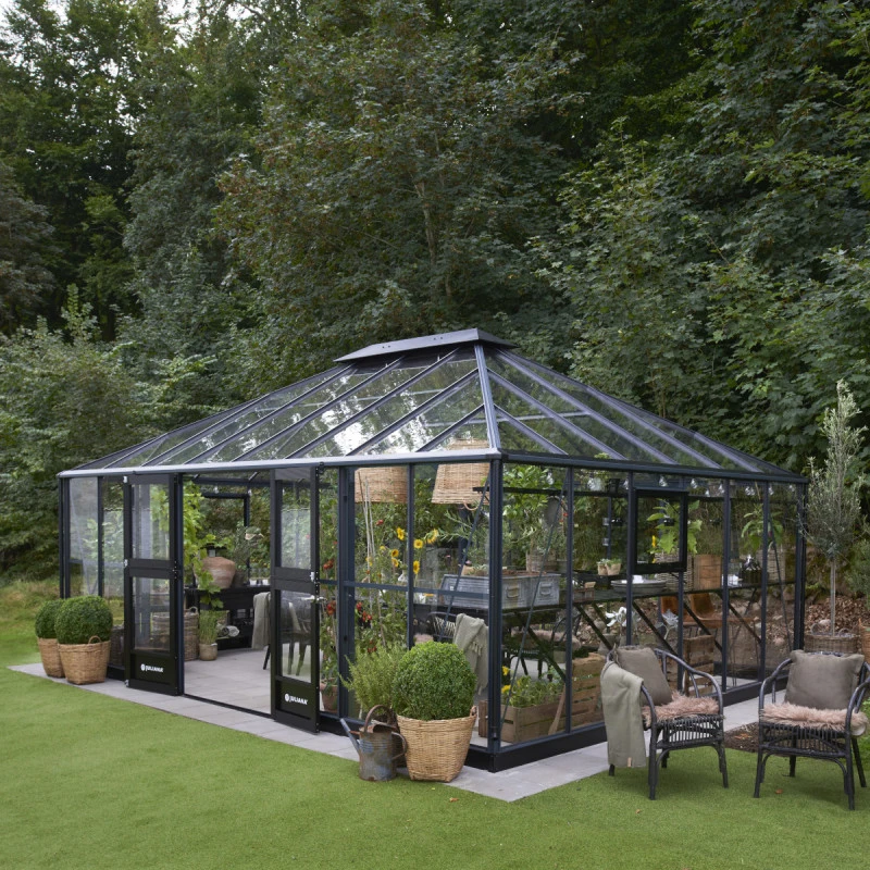L’avis du spécialiste sur la serre de jardin Grand Oase 25,6m²en aluminium noir et verre trempé 3mm – Juliana