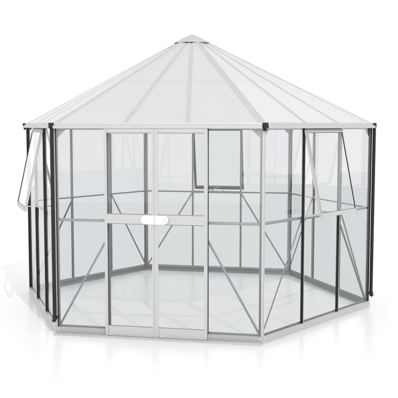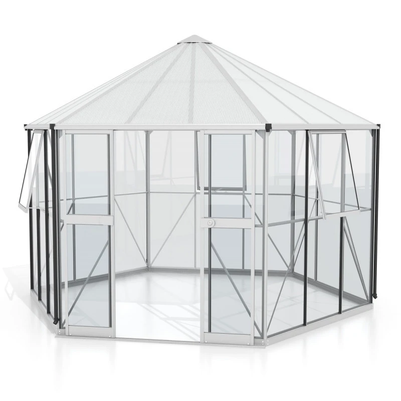 À l’image d’un pavillon élégant, la serre de jardin Galaxis 9000 du fabricant Vitavia embellira votre environnement tout en vous offrant un intérieur spacieux et confortable pour la culture de vos plantes. C’est son toit hexagonal qui attire les regards et permet d’obtenir une belle hauteur sous faîtage de 284cm. Travailler sans vous courber et vous déplacer librement n’est plus un défi !