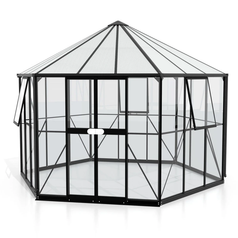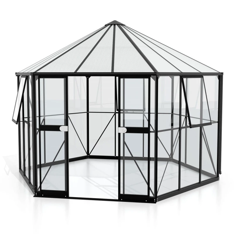 L’avis du spécialistesur la serre de jardin hexagonale Galaxis 9m² en aluminium noir et vitrage combiné – Vitavia :