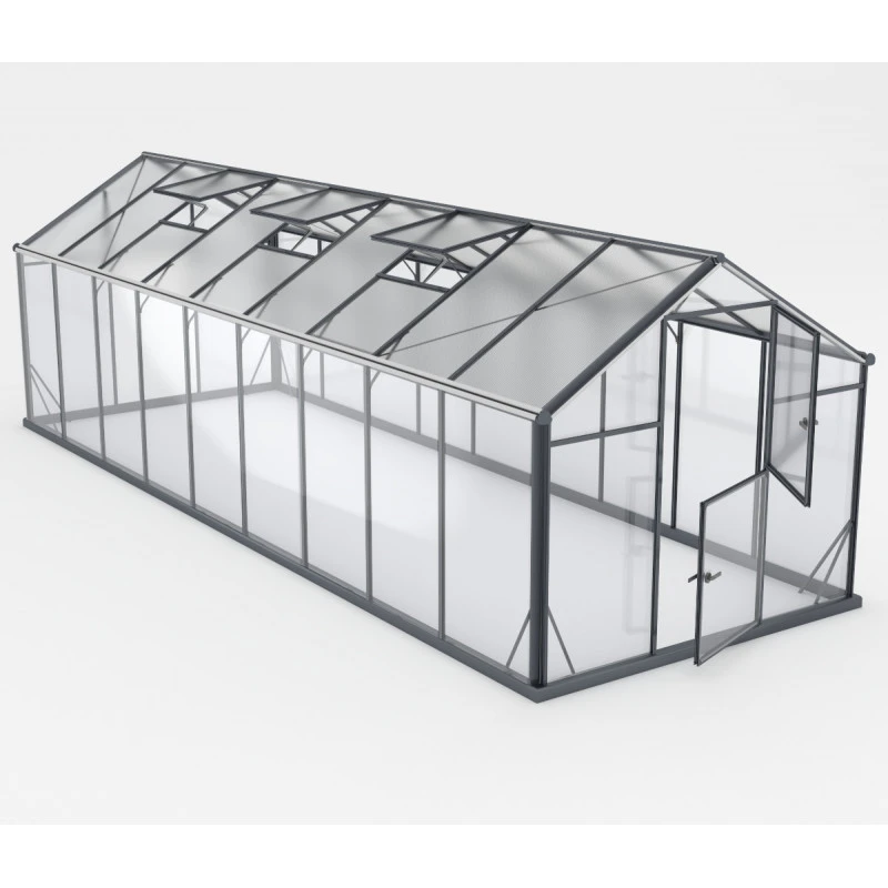 Les panneaux de toiture sont en polycarbonate de 6mm d’épaisseur, ils sont légers à manipuler et s’insèrent en toute simplicité dans les profils en aluminium thermo laqué gris anthracite. L’avantage d’une toiture en polycarbonate est le léger ombrage apporté, pour préserver vos plantations en cas de grosses chaleurs, et la diffraction de la lumière directe du soleil. Ils sont d’un entretien facile et sont recouverts d’une couche protectrice anti-UV.