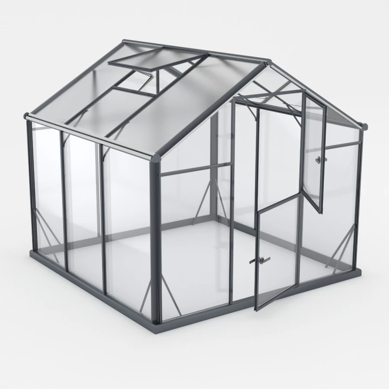Les panneaux de toiture sont en polycarbonate de 6mm d’épaisseur, ils sont légers à manipuler et s’insèrent en toute simplicité dans les profils en aluminium thermo laqué gris anthracite. L’avantage d’une toiture en polycarbonate est le léger ombrage apporté, pour préserver vos plantations en cas de grosses chaleurs, et la diffraction de la lumière directe du soleil. Ils sont d’un entretien facile et sont recouverts d’une couche protectrice anti-UV.