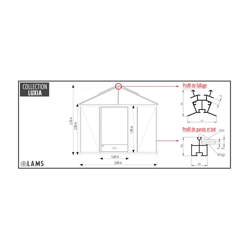 Ce modèle d’une surface de 18,70m² est le plus grand de la collection de serres Luxia, fabriquées en Vendée par le spécialiste des serres depuis 1993 Lams. Elle est dotée de finitions exclusives très soignées, comme les descentes et connexions de gouttière en fonderie d’aluminium ou les moulures qui ornent la large porte coulissante. Cette porte a une largeur de passage de 100cm pour une hauteur de 195cm et vous permettra d’accéder en tout confort dans votre serre.