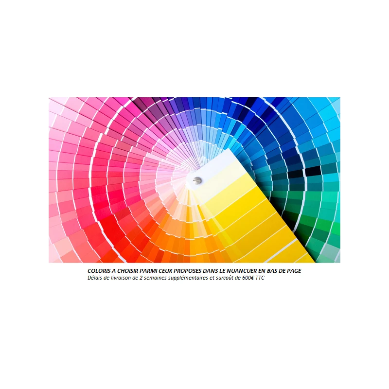 • Coloris : 12 coloris disponibles par défaut ou tout autre coloris RAL sur demande (se référer au nuancier en bas de page, délai de livraison rallongé de 2 semaines et surcoût de 600€ TTC)