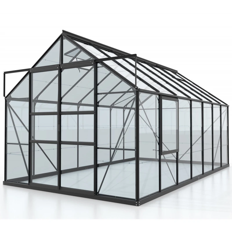 La serre de jardin Meridian2 possède une structure robuste en aluminium. La peinture noire appliquée par poudrage lui donne un bel aspect à long terme et améliore sa résistance aux intempéries et à la corrosion. Le montage des vitres par chevauchement et l’embase en acier galvanisé, disponible en option, contribuent également à sa stabilité optimale.