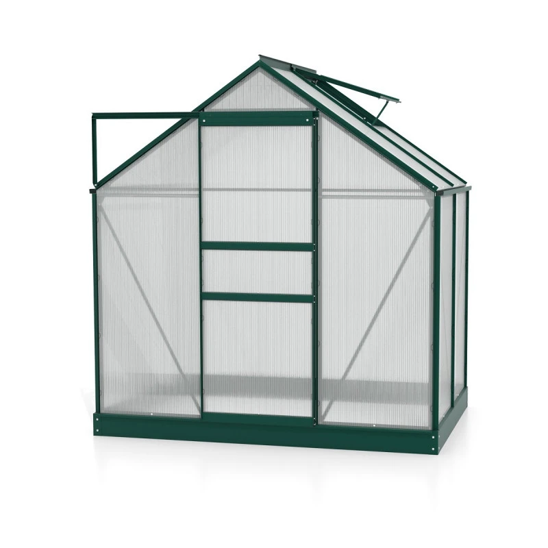 La serre de jardin Planet possède une structure solide et robuste en aluminium. Le revêtement en poudre de couleur verte émeraude est une finition de qualité qui renforce la résistance de l’aluminium aux aléas climatiques et à la corrosion tout en donnant à la serre un aspect bel et original à long terme. L’embase en acier incluse assure la stabilité optimale de la structure et son installation correcte au niveau du sol et à angle droit.