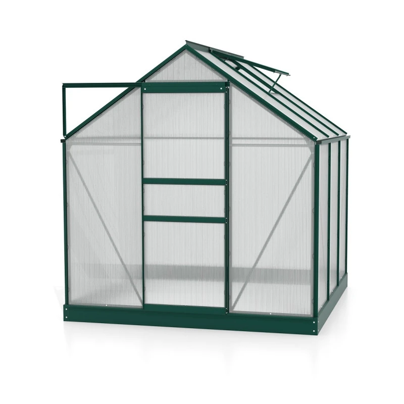 La serre de jardin en alu et polycarbonate Planet est livrée totalement équipée et prête à être installée. Elle est dotée d’une porte coulissante, cadenassable (cadenas non fourni) et montée sur roulement à billes pour un accès aisé et confortable. Une ou deux fenêtres du toit et des gouttières sont également incluses pour aérer la serre et évacuer rapidement les eaux pluviales.