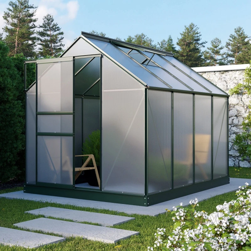 La serre de jardin en alu et polycarbonate Planet est livrée totalement équipée et prête à être installée. Elle est dotée d’une porte coulissante, cadenassable (cadenas non fourni) et montée sur roulement à billes pour un accès aisé et confortable. Une ou deux fenêtres du toit et des gouttières sont également incluses pour aérer la serre et évacuer rapidement les eaux pluviales.
