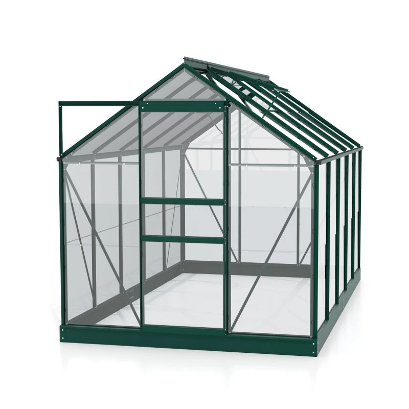 La serre de jardin Planet séduit par sa structure en vert émeraude qui lui donne une allure élégante et tendance. Le revêtement en poudrage couvre les profilés en aluminium et améliore leur résistance aux intempéries et à la corrosion. Pour une grande robustesse, l’embase en acier galvanisé est incluse et vous pouvez monter votre serre Vitavia d’une manière correcte au niveau du sol et à angle droit.