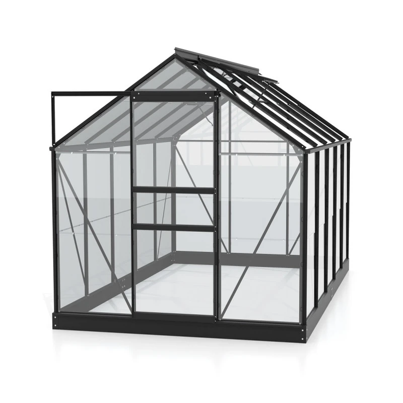 La serre de jardin en alu et verre Planet esf dotée d’une porte coulissante montée sur roulement à billes. Vous pouvez la fermer avec un cadenas (non fourni). Les fenêtres de toit et les gouttières sont également incluses pour obtenir une aération naturelle et une évacuation rapide des eaux pluviales.