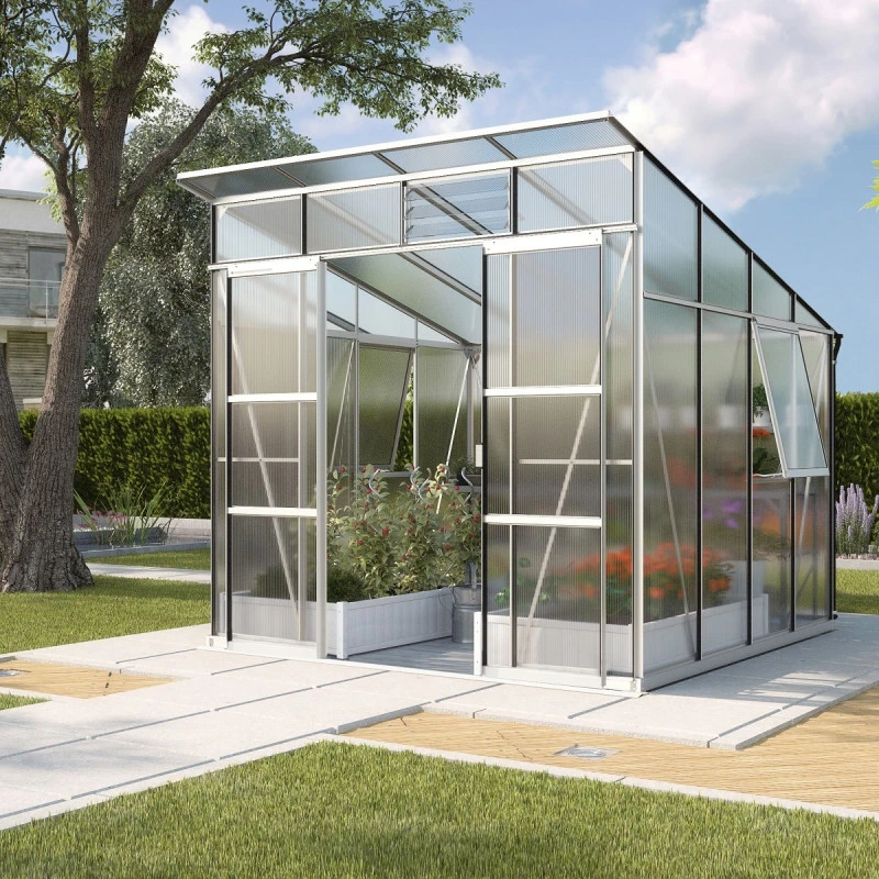 La serre de jardin Playa du fabricant Vitavia possède un design résolument moderne avec son toit incliné et sa façade haute. Elle vous invite à jardiner sous une surface au choix – 5,9m² ou 7,6m² et dans une ambiance agréable et sereine.
