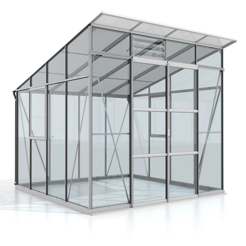 . Vitrage combiné en plaques en polycarbonate alvéolaire de 6mm pratiquement incassables sur le toit et panneaux e nverre de sécurité sur les côtés, assemblage solide par emboîtement