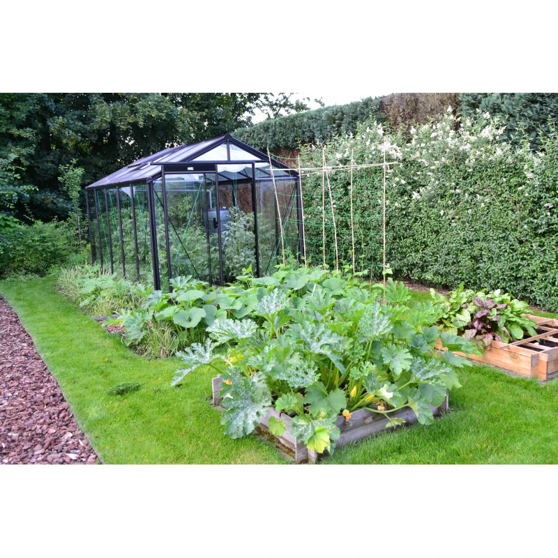 Avec sa hauteur faîtière de 235cm sur des parois de 178cm, vous pourrez vous y déplacer en toute aisance et confort, et optimiser le volume de culture via un agencement vertical au moyen du mobilier pour serre disponible en accessoire : étagères, table de culture, kit de palissage. Cette serre est équipée d’une lucarne, dont le cadre est lui-aussi en aluminium laqué noir pour une intégration parfaite dans la structure.