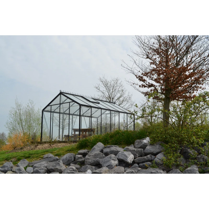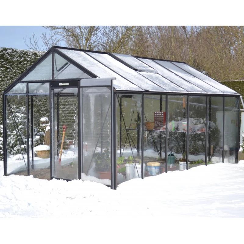 La serre Prestige Grow R306 collection Blackline possède un look élégant et art nouveau, avec sa structure en aluminium laqué noir RAL9005, qui se fondra joliment dans votre environnement. Le vitrage en verre trempé est cristallin au niveau des parois, pour un apport maximal de lumière solaire et pour que vous puissiez contempler vos cultures. Le vitrage de la toiture est lui-aussi en verre de sécurité, mais martelé, avec des motifs qui procurent un léger voilage pour atténuer les rayons intenses du soleil lorsqu’il est au zénith.