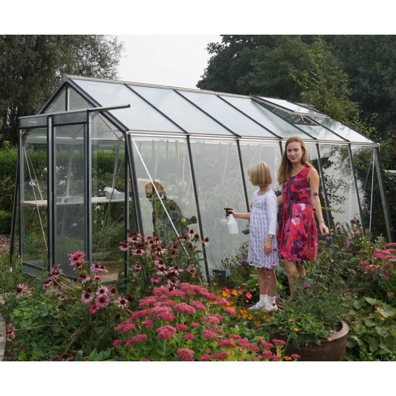 La structure en aluminium est robuste, et le vitrage se compose intégralement de verre trempé. C’est du verre de sécurité, 7 fois plus résistant que le verre horticole, d’une transparence cristalline au niveau des parois et martelé en toiture.