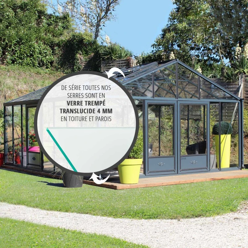 Le vitrage est du verre trempé de 4mm d’épaisseur, disponible en verre martelé pour la toiture sans aucun supplément de prix. La fixation et l’étanchéité du vitrage sont assurés par des joints en néoprène, garantis 10 ans, qui peuvent recevoir une épaisseur de double vitrage en verre jusqu’à 14mm ou pour du polycarbonate alvéolaire de 16mm. Cette serre est dotée de 5 lucarnes de toit (dimensions 82,5cmx73cm) et bénéficie d’une garantie de 12 ans sur sa structure.