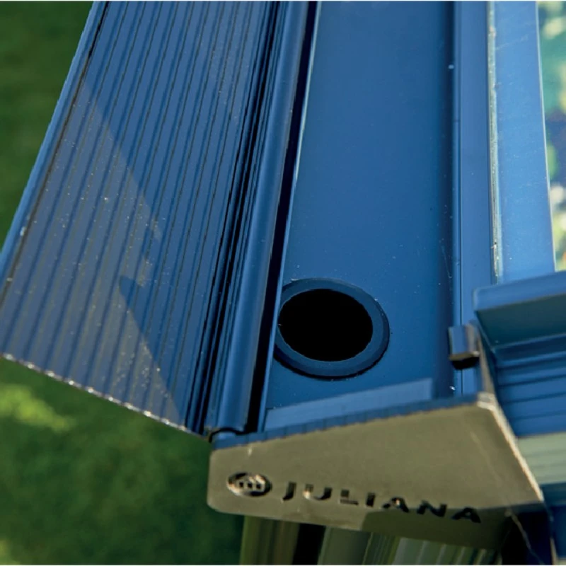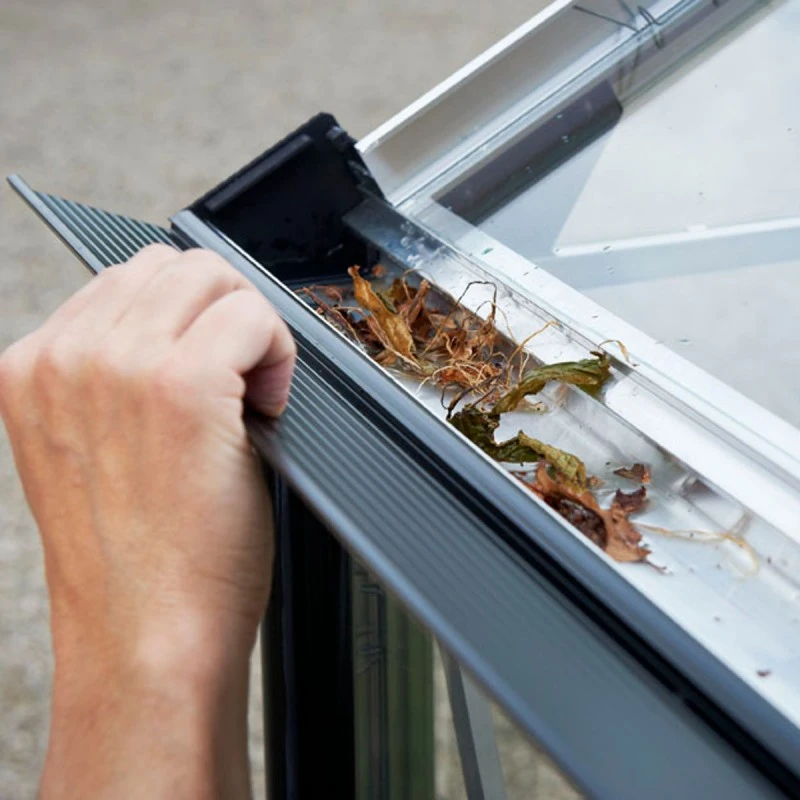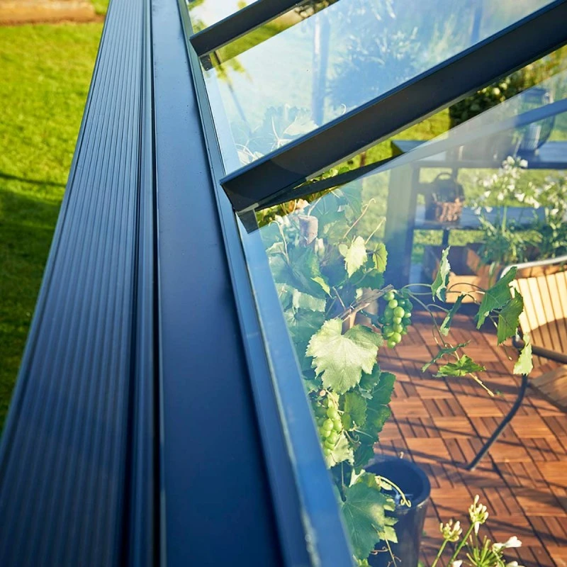 Les gouttières sur le périmètre de la serre canaliseront l’eau de pluie, pour la récolter ou la dévier. Le vitrage est du verre trempé de 3mm d’épaisseur, très solide et cependant léger à manier. Le verre trempé est dit verre de sécurité puisque en cas de bris (peu probable) il se fragmente en petits morceaux non coupant, améliorant l’aspect sécuritaire du produit. Ce verre est d’une belle transparence, et est constitué de panneaux entiers, pour un assemblage facile et rapide. Enfin, cette serre exceptionnelle fabriquée au Danemark jouit d’une garantie de 12 ans.
