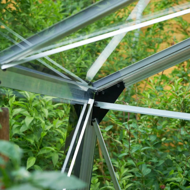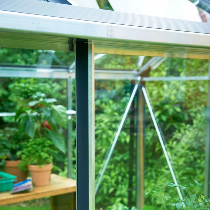 Les belles dimensions de la serre permettent une utilisation comme serre horticole ou comme jardin d’hiver. La hauteur faîtière de 306cm et les parois de 192cm développent une surface de 18,8m² sur laquelle vous pourrez vous déplacer en toute aisance, installer du mobilier de jardin conséquent ou pratique la culture de plantes hautes par palissage.