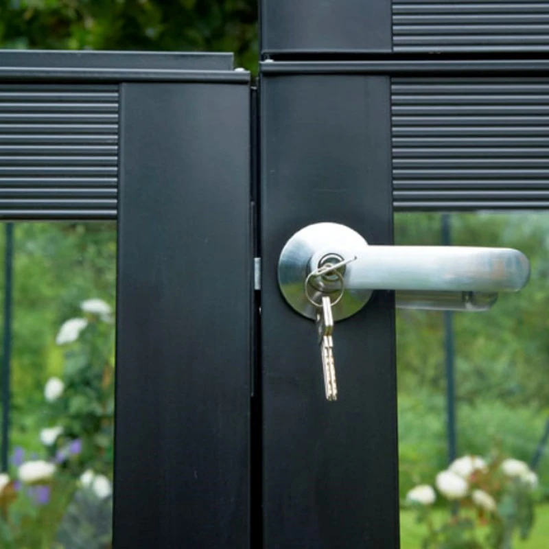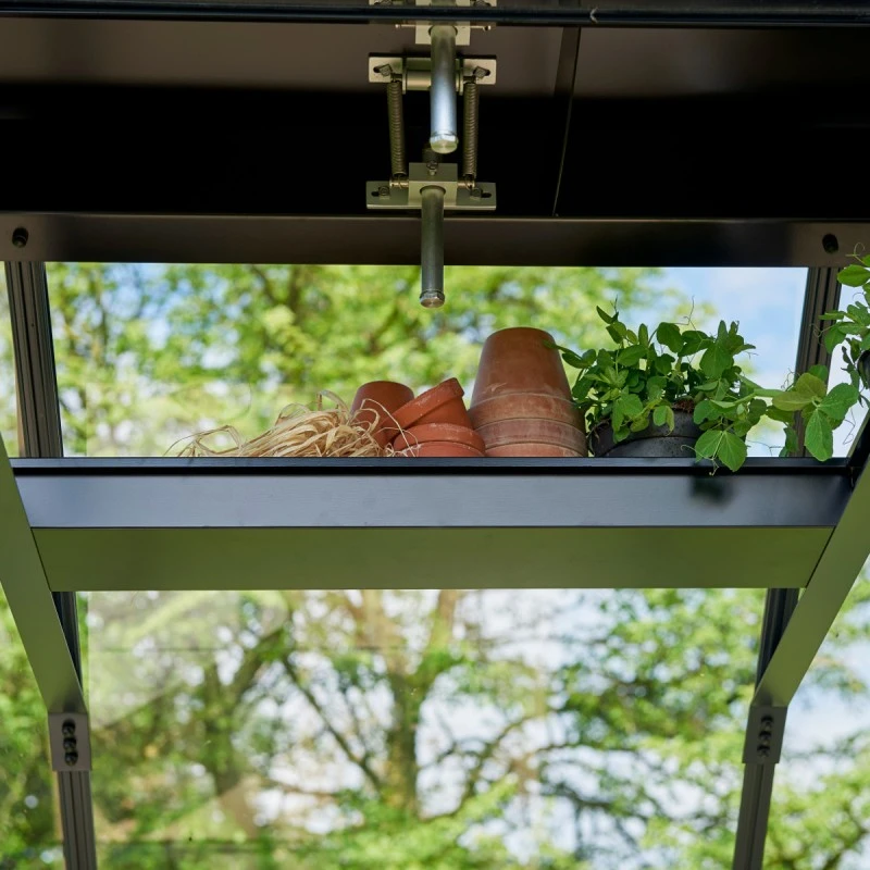 La structure est composée de profilés robustes en aluminium anthracite, et comprend quatre fenêtres latérales. Un système d’aération en toiture permet le renouvellement permanent de l’air. La double porte offre un accès aisé, c’est une porte de type écurie dont les panneaux supérieurs et inférieurs peuvent être ouverts indépendamment. Vous pouvez ainsi créer un courant d’air ciblé sur les parties basses ou hautes de vos cultures.