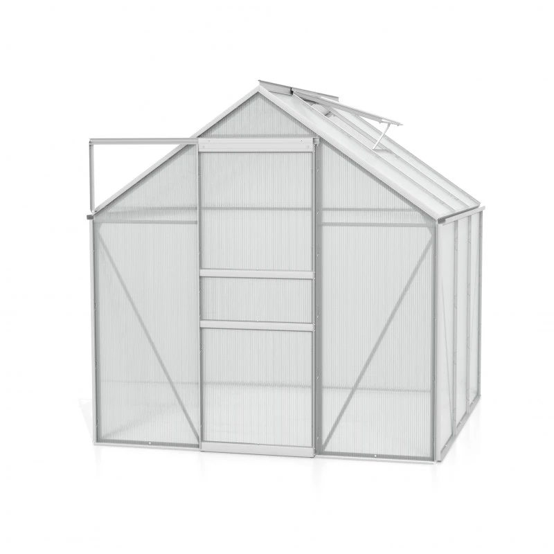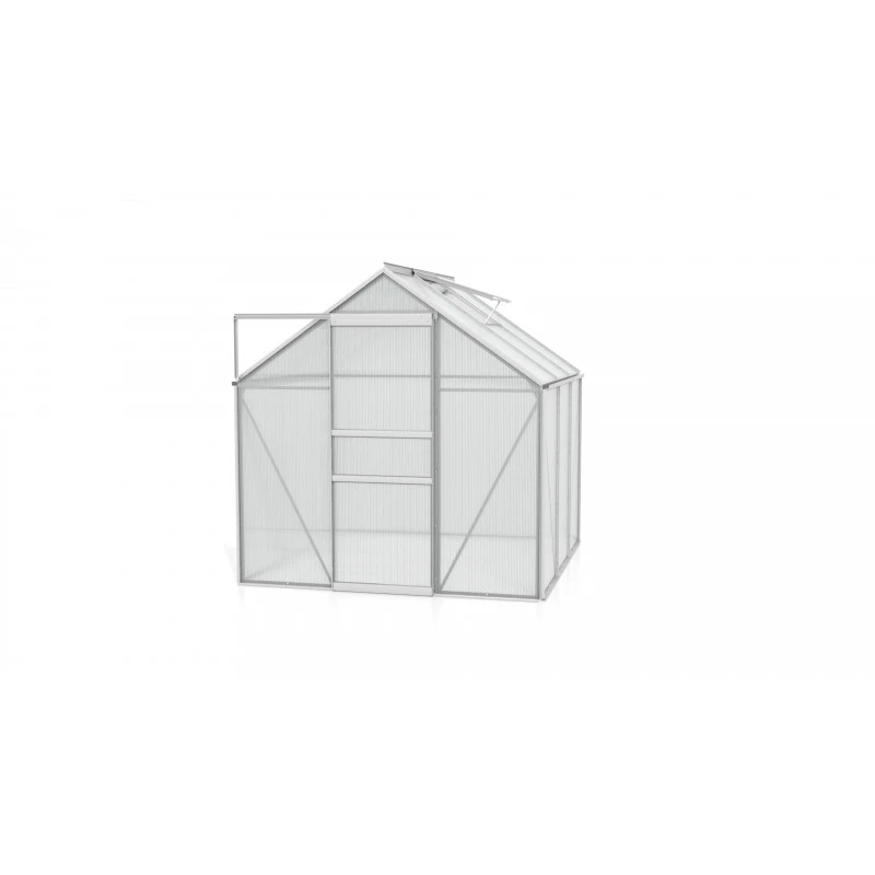 La serre de jardin en alu et polycarbonate Venus 3800 est équipée d’une porte coulissante facile à manier et montée sur roulement à billes (largeur : 61cm, hauteur : 161cm) ainsi que d’une fenêtre de toit et de gouttières. L’aération naturelle et la collecte des eaux pluviales sont garanties !