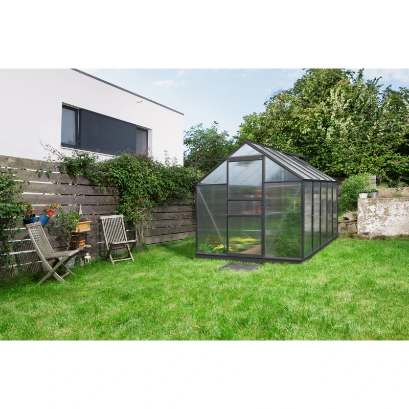 Les profilés étroits de la serre de jardin Venus 6200 sont en aluminium avec revêtement en poudre d’une couleur noire élégante. Cette peinture de qualité renforce la résistance de la structure à la corrosion et aux intempéries et lui assure une belle apparence à long terme.