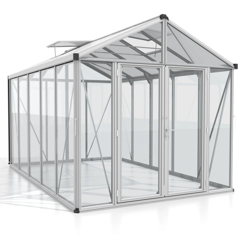 La serre de jardin Zeus Comfort 10000 est un modèle durable et robuste qui ne craint ni la corrosion ni les intempéries. La structure est conçue en aluminium anodisé ou noir avec profilés à double cadre qui assurent un montage solide aux panneaux de vitrage. Ils sont pratiquement emboîtés entre le cadre et les baguettes en aluminium vissées. La stabilité optimale est garantie également par le profilé de sol intégré.