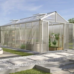 Robuste et durable, la serre de jardin en alu Zeus Comfort 15700 est proposée avec 3 types de vitrage en fonction de vos besoins de culture. Les panneaux sur les côtés peuvent être en polycarbonate – 10mm ou 16mm, ou en verre de sécurité de 3mm. Les panneaux de toit sont toujours en polycarbonate d’au moins 10mm d’épaisseur pour protéger vos plantes des rayons nocifs du soleil. Ils sont glissés dans le cadre. Le polycarbonate est apprécié pour ses propriétés isolantes, son traitement anti-UV, sa résistance aux chocs et sa surface laiteuse qui réfracte la lumière. Le verre de sécurité est d’un aspect cristallin ce qui rend l’intérieur de la serre extrêmement lumineux. Son grand atout, c’est sa capacité de se fragmenter en petits morceaux non tranchants en cas de casse ce qui réduit fortement le risque de blessures.