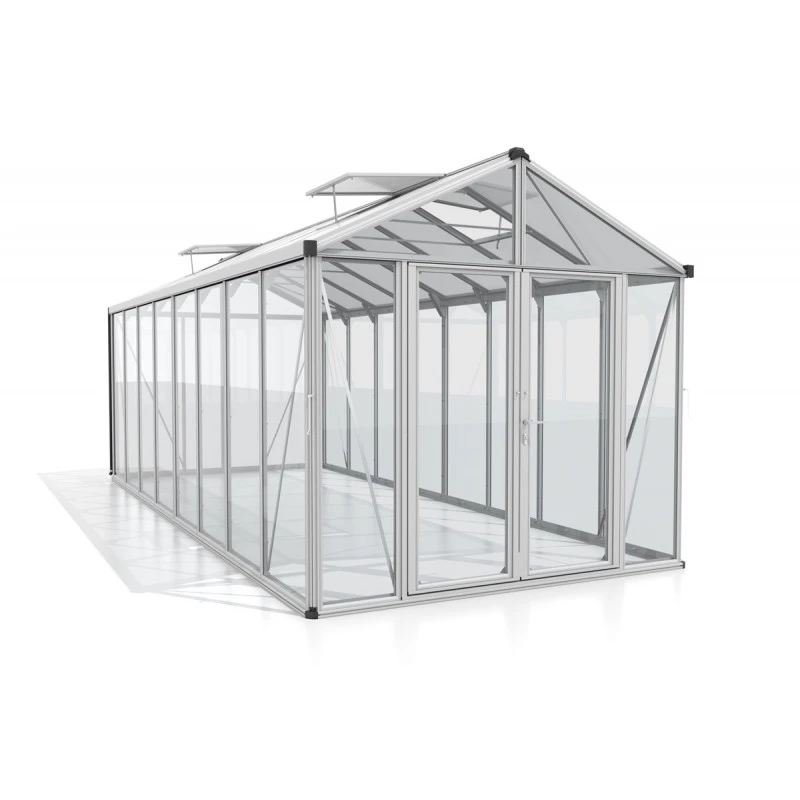 Robuste et durable, la serre de jardin en alu Zeus Comfort 15700 est proposée avec 3 types de vitrage en fonction de vos besoins de culture. Les panneaux sur les côtés peuvent être en polycarbonate – 10mm ou 16mm, ou en verre de sécurité de 3mm. Les panneaux de toit sont toujours en polycarbonate d’au moins 10mm d’épaisseur pour protéger vos plantes des rayons nocifs du soleil. Ils sont glissés dans le cadre. Le polycarbonate est apprécié pour ses propriétés isolantes, son traitement anti-UV, sa résistance aux chocs et sa surface laiteuse qui réfracte la lumière. Le verre de sécurité est d’un aspect cristallin ce qui rend l’intérieur de la serre extrêmement lumineux. Son grand atout, c’est sa capacité de se fragmenter en petits morceaux non tranchants en cas de casse ce qui réduit fortement le risque de blessures.