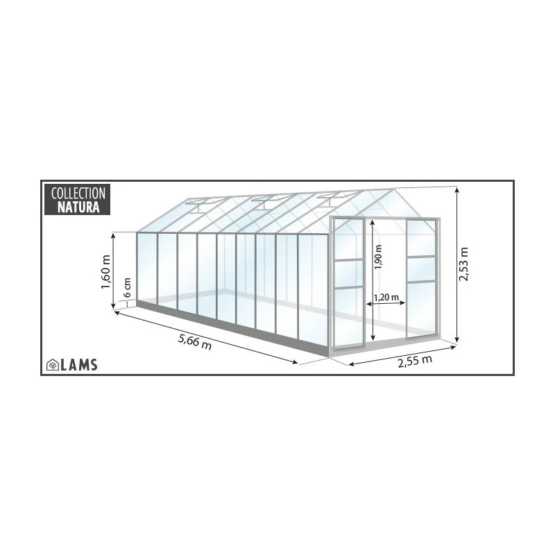 Avec une hauteur faîtière de 253cm et des parois de 160cm, cette serre libère un volume utile confortable pour vous y déplacer, cultiver des plantes hautes et mettre en place un système de palissage. La serre du fabricant français Lams est dotée de 6 lucarnes de ventilation, pouvant être équipées de compas pour ouverture automatique disponibles en accessoires, et de gouttières pour la récolte de l’eau pluviale. L’accès est pratique, par la large double porte coulissant de 120x190cm qui peut être laissée ouverte lorsque vous avez les mains encombrées ou que vous poussez une brouette. La garantie est de 10 ans sur la structure et de 5 ans sur les joints d’étanchéité.