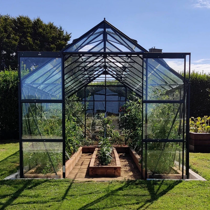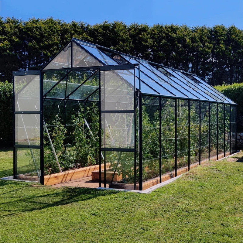 Pour une installation en pleine terre, 4 pieds de fixation fournis peuvent être coulés dans des plots de béton pour une résistance accrue aux éléments ou simplement enterrés au cas où vous voudriez déplacer votre serre ultérieurement. Le poids du vitrage en verre trempé de 3mm d’épaisseur améliore également sa tenue au vent. Cette serre est conçue pour pouvoir être installée facilement par l’utilisateur. Les profilés en aluminium sont pré-percés et d’un maniement léger.