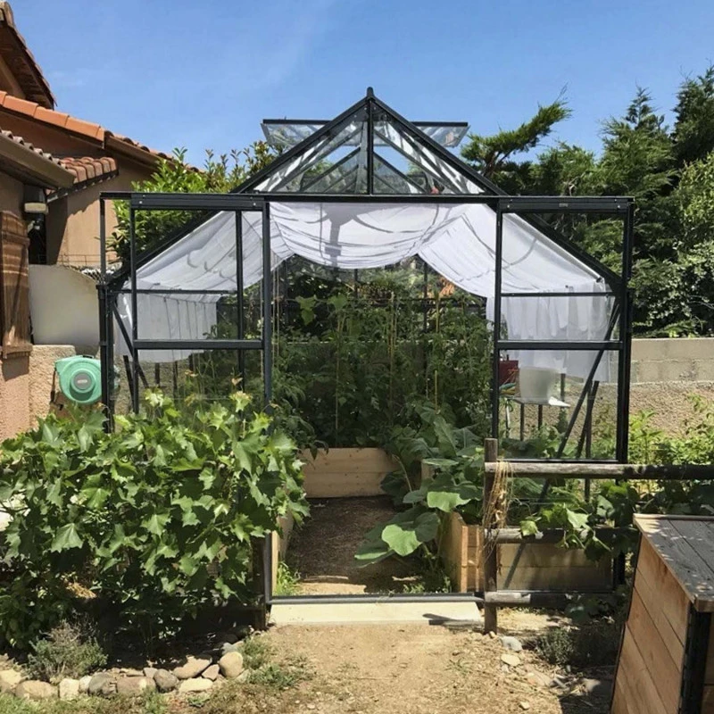 Le vitrage qui recouvre les parois est du verre trempé de 3mm d’épaisseur, qui participe également à optimiser l’assise de la serre grâce à son poids conséquent. Le verre trempé a subi un traitement thermique qui lui confère une résistance 7 fois supérieure au verre horticole ordinaire, dit verre blanc. Dans le cas peu probable d’un bris, il se fragmente en petits morceaux non tranchants. Le verre a une transparence cristalline, qui mettra en valeur vos plantations. Le vitrage et la structure en aluminium laqué sont d’un entretien très facile, il suffit d’un nettoyage annuel à l’eau savonneuse pour leur rendre leur éclat.