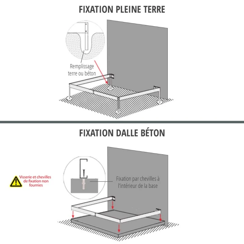 Les profilés de la structure sont en aluminium non laqué, ils s’accordent au coloris de l’embase de 6cm en acier galvanisé fourni. L’aluminium jouit d’une excellente longévité, et ne requiert que peu d’entretien. Les profilés sont aussi très légers, ce qui est un avantage pour le maniement lors du montage. Ils sont pré-percés et prêts à être assemblés, avec la visserie en acier inoxydable, en suivant la notice de montage détaillée.