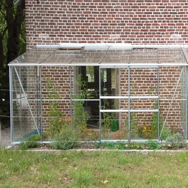 L’installation se fait de préférence à deux personnes, sur une surface parfaitement plane, et d’équerre avec la paroi sur laquelle viendra s’appuyer la structure. Assurez-vous d’avoir une hauteur disponible d’au moins 230cm, puisque la hauteur faîtière est de 227cm (embase de 6cm incluse). Sur la façade de 379cm, une double porte coulissante de belles dimensions (120x169cm) offre un passage aisé et confortable, et ne risquant pas de battre brutalement en cas de coup de vent. Vous pouvez fixer la porte simple supplémentaire (60x169cm) à droite ou à gauche, ce qui vous offre un accès optimal à la serre.