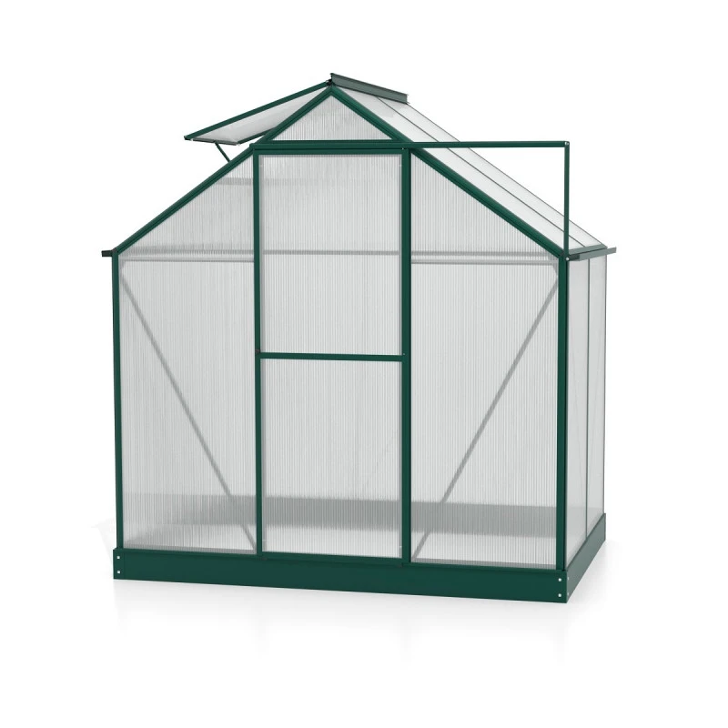 La serre de jardin Triton possède une structure robuste en aluminium qui la protège parfaitement contre la corrosion et les intempéries. La peinture vert émeraude appliquée par poudrage renforce davantage sa résistance tandis que les profilés aplatis lui donnent une élégance particulière. L’embase en acier galvanisé incluse, haute de 12,5cm assure une stabilité optimale au sol et une installation correcte à angle droit.