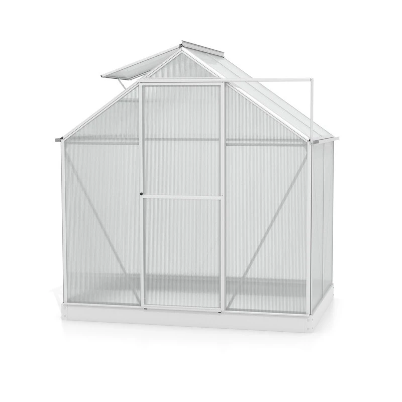 La serre de jardin en alu et polycarbonate Triton a le grand atout d’être équipée d’une porte simple à monter au choix comme porte coulissante ou battante. Large de 61cm et haute de 164cm, elle offre un accès aisé et assure une ventilation naturelle. Les fenêtres de toit incluses (une ou deux selon la taille de la serre) apportent également un courant d’air frais à vos plantes tandis que les gouttières fournies vous permettent d’évacuer rapidement les eaux pluviales.
