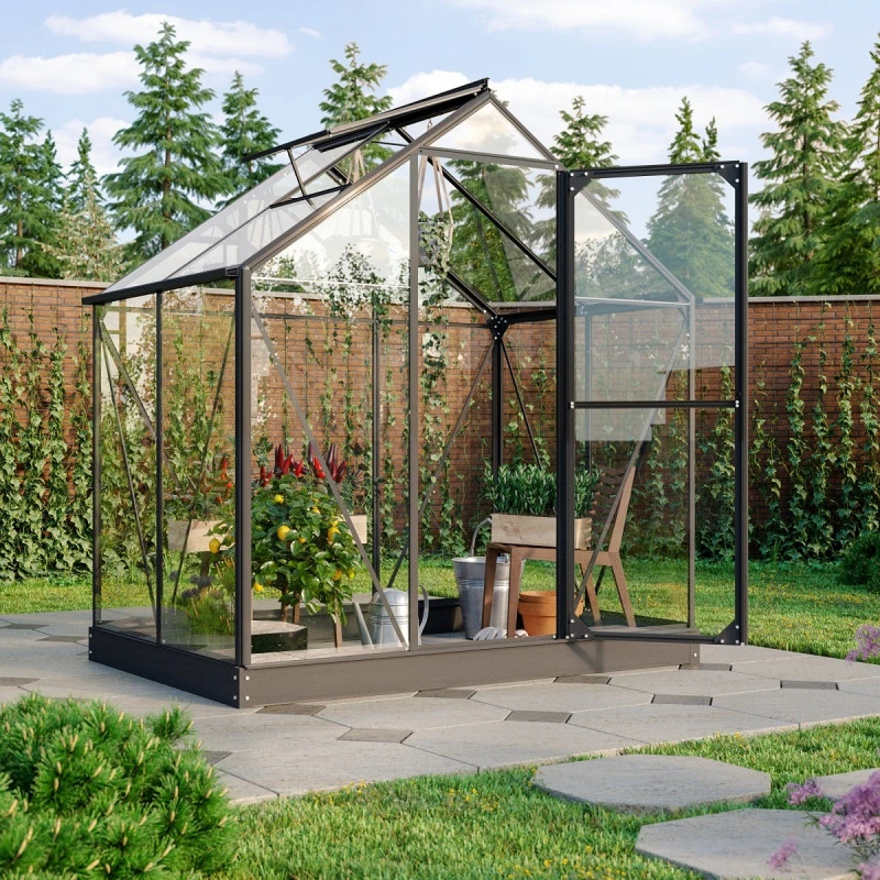 La serre de jardin Triton bénéficie d’une résistance élevée aux intempéries et à la corrosion grâce à sa structure en aluminium peint par poudrage. La couleur noire ajoute une touche originale et garde son bel aspect à long terme. La stabilité aux vents est également garantie par la technique de glissement utilisée pour le montage des vitres. Les panneaux sont insérés directement dans les profilés aplatis de la structure sans pinces ni agrafes. L’installation correcte de la serre est assurée par l’embase en acier galvanisé qui fait partie de son équipement initial.