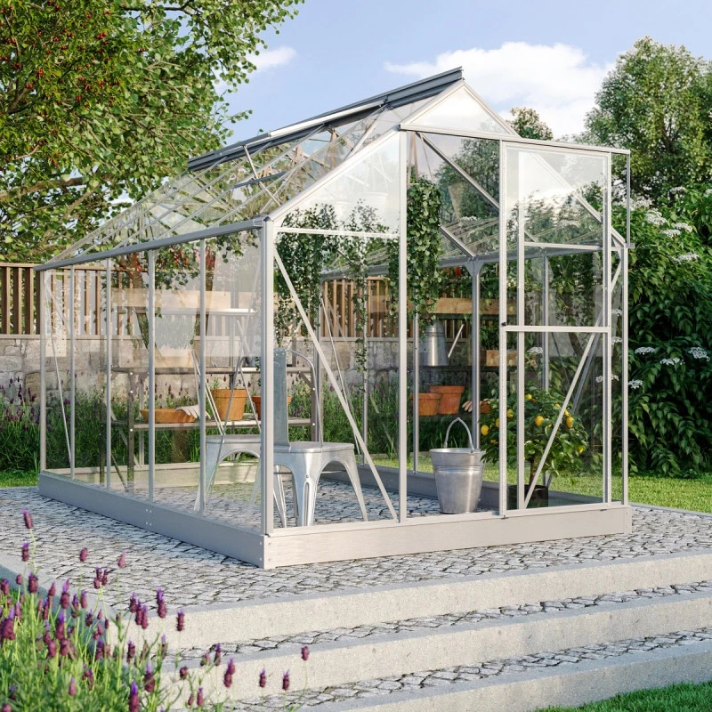 La serre de jardin Triton est équipée d’une porte simple avec montage au choix – coulissante pour gagner de la place ou battante. Une ou deux fenêtres de toit et des gouttières sont également incluses pour assurer le courant d’air frais et l’évacuation rapide des eaux pluviales.