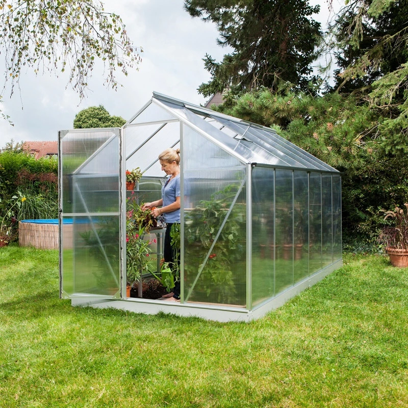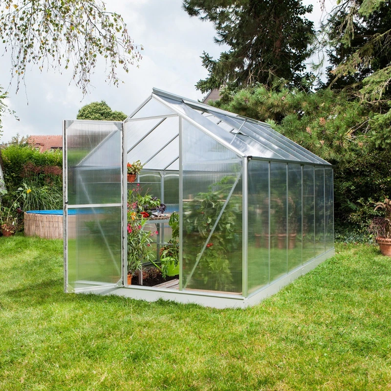 La serre de jardin Triton se distingue par ses profilés aplatis en aluminium anodisé qui lui assurent un bel aspect à long terme et une grande résistance face aux intempéries et à la corrosion. Les profilés garantissent aussi une résistance élevée aux vents grâce au montage innovant du vitrage. Les pinces sont remplacées par une technique de glissement et les vitres s’insèrent dans les profilés sur toute leur longueur. L’embase en acier est également incluse afin d’obtenir une stabilité optimale au sol et une installation correcte à angle droit.