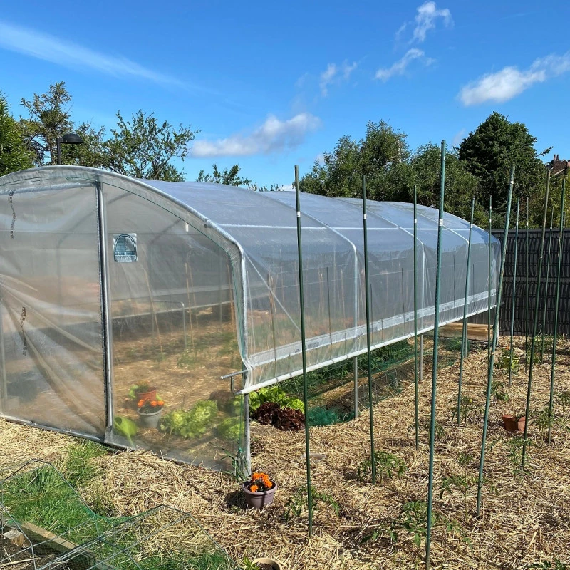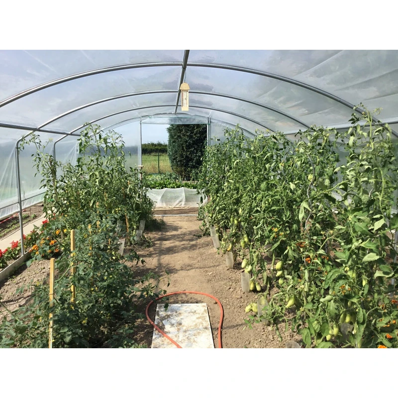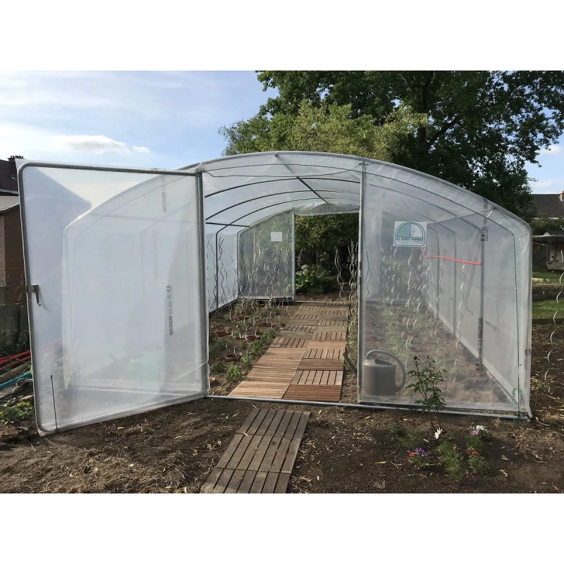 Ce modèle est équipé d’une bâche en PE de 200µ NF très résistante et traitée anti-UV pour la couverture et sur les pignons.
