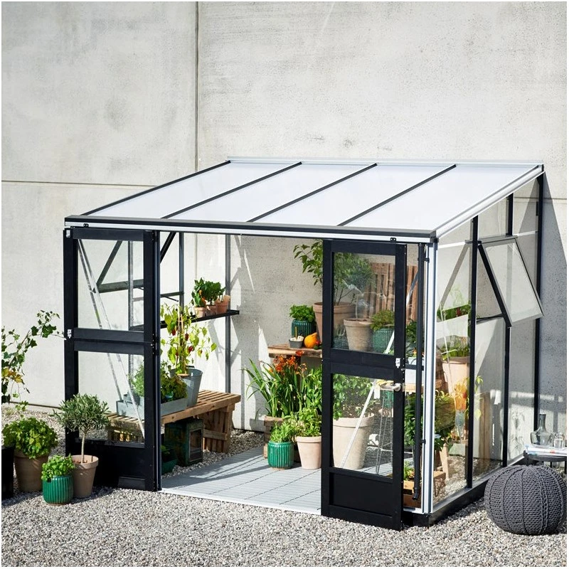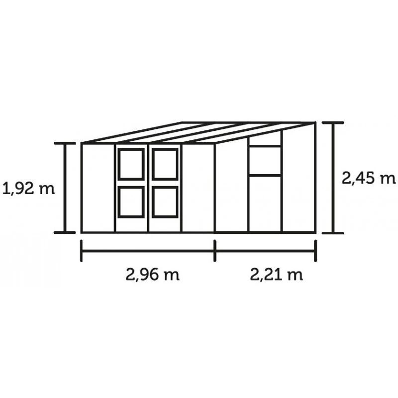 Très recherchée, cette surface de serre adossée est idéale pour les petits espaces. Très fonctionnelle grâce à son volume dégagé dû à des hauteurs de rives et de faîtage élevées, elle offre un espace de travail agréable.