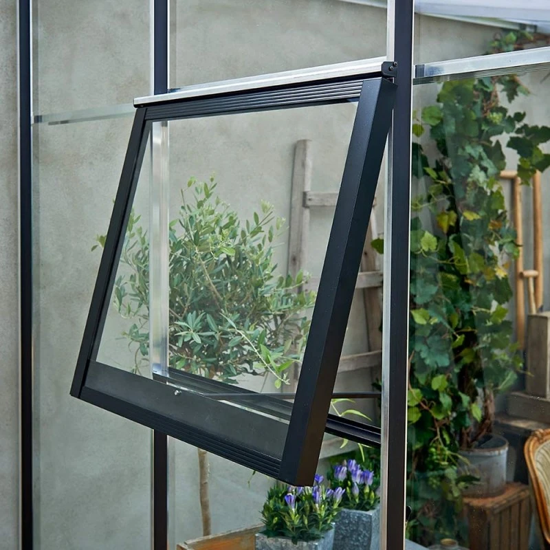 Cette serre adossée dispose de 2 fenêtres latérales qui permettent un renouvellement d’air très rapide, notamment quand vous ouvrez en simultané la double porte frontale de type étable. Cette porte vous permet d’ouvrir les 4 battants de la porte indépendamment les uns des autres. Vous pourrez ainsi opter pour une ouverture totale ou uniquement les 1 ou 2 battants supérieurs si vous désirez aérer la serre, tout en bloquant l’accès à des enfants ou des animaux domestiques par exemple.